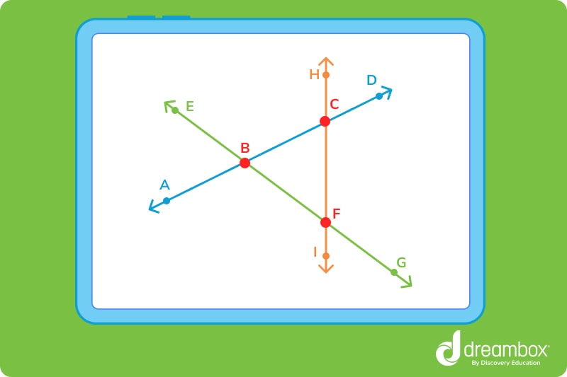 In this example, we have labeled the point of intersection and each line segment with letters. You can describe these intersections using geometric notation.
