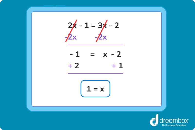 Since both lines equal y, using the rule of equality, we can conclude that 2x – 1 = 3x – 2. Now, solve for x.