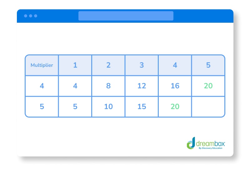 Start by making three rows on your paper, one for the numbers you will multiply by (the multipliers: 1, 2, 3, and so on), one for multiples of 4, and one for the multiples of 5.