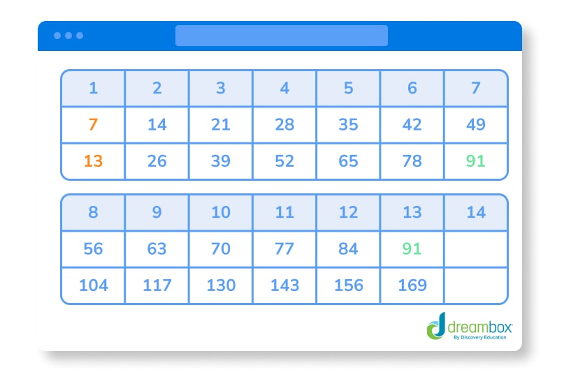 As before, write out your table and start figuring out the multiples of 7 and 13 — up to the multiplier 7. This is because 7 x 13 will be a common multiple for sure.