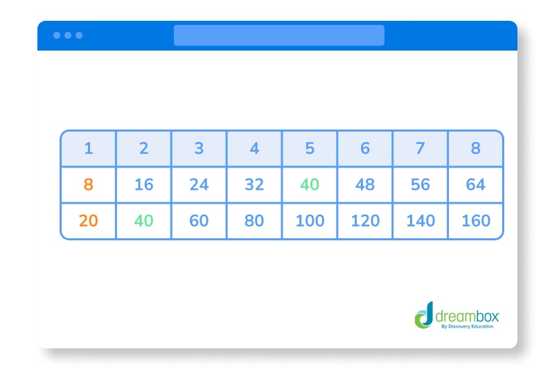 1. Find the LCM of 8 and 20 by listing multiples.