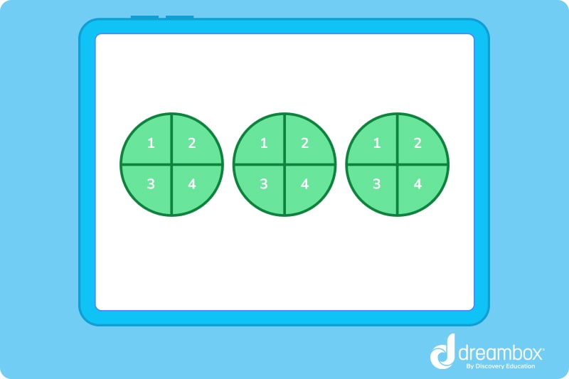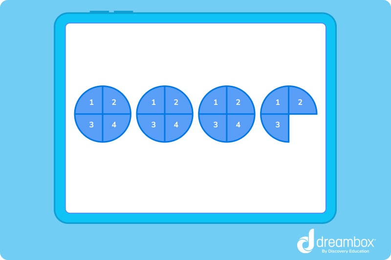 In our example, we have 15 parts, with each whole circle being split into quarters. With the use of a visual aid, it looks like this: