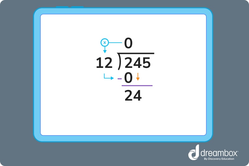 Step 2: Now, let’s compare the 12 with the first digit of 245. We know 2 does not go into 2, so we see if it goes into the first 2 digits of the dividend, 24. 2*12=24, so we put a 2 above the tens place in our quotient, multiply it out, subtract, then bring down the next digit.