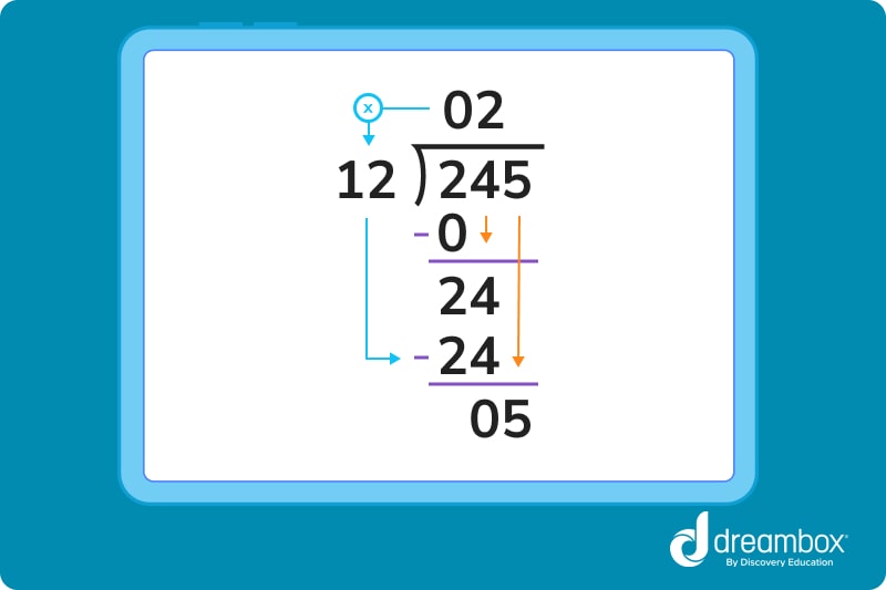 Step 4: 24 – 24 = 0, and now we can drag the 5 down next to this zero. 12 is larger than 5, so we place another 0 in our quotient.