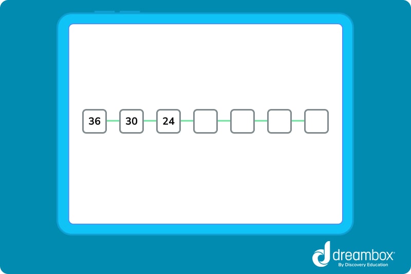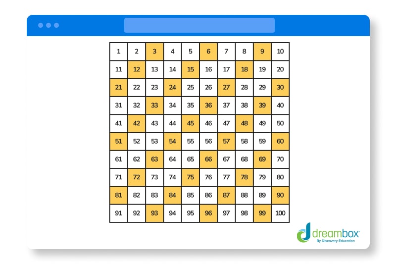 In this skip counting chart, every third square is colored yellow. Similar to using a number line, the colored skip counting chart allows the student to visualize each number. You can use a skip counting chart for any number. Also, DreamBox’s math practice app offers even more opportunity to practice skip counting skills.