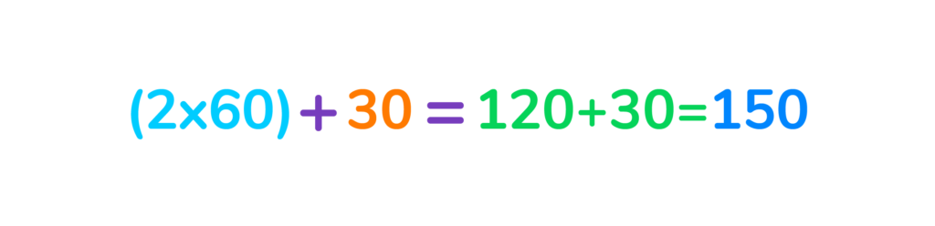 Ex. Convert two and a half hours to minutes. Multiply 2 by 60 to get 120. Add 30 minutes. 120+30=150. There are 150 minutes in two and a half hours.