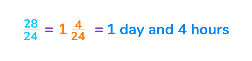 Ex. Convert 28 hours to days. Divide 28 by 24. Twenty-four goes into 28 one time. The remainder is 4. So, there is 1 day and 4 hours in 28 hours.