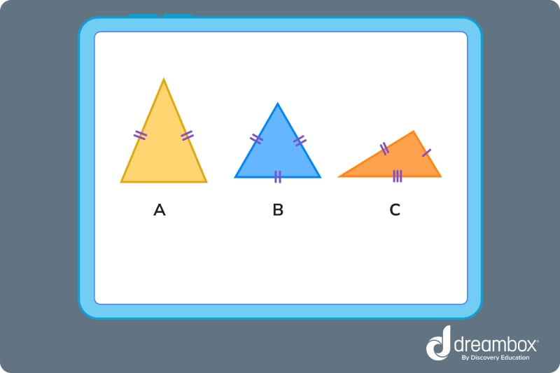 2. Using the hash marks, we can see that triangle A has 2 equal sides. Triangle B is an equilateral triangle, and triangle C is a scalene triangle. -