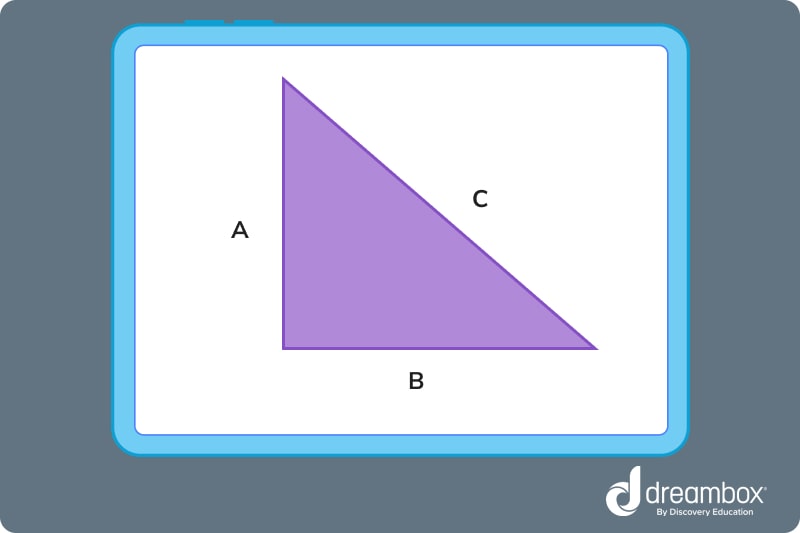 A right triangle has all the same parts as the isosceles triangle. However, there’s a fancy word for the name of the right triangle’s longest side: the hypotenuse.