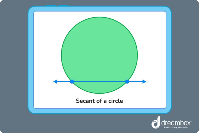 A secant is a straight line that intersects a circle in two places and continues on outside of the circle. Imagine that you lay your pencil down on top of a circular cookie. Your pencil is now a secant!